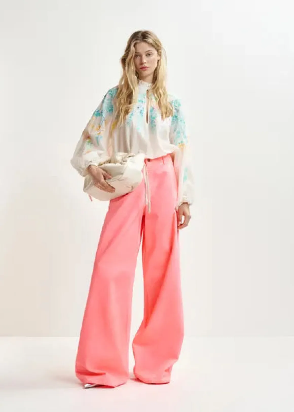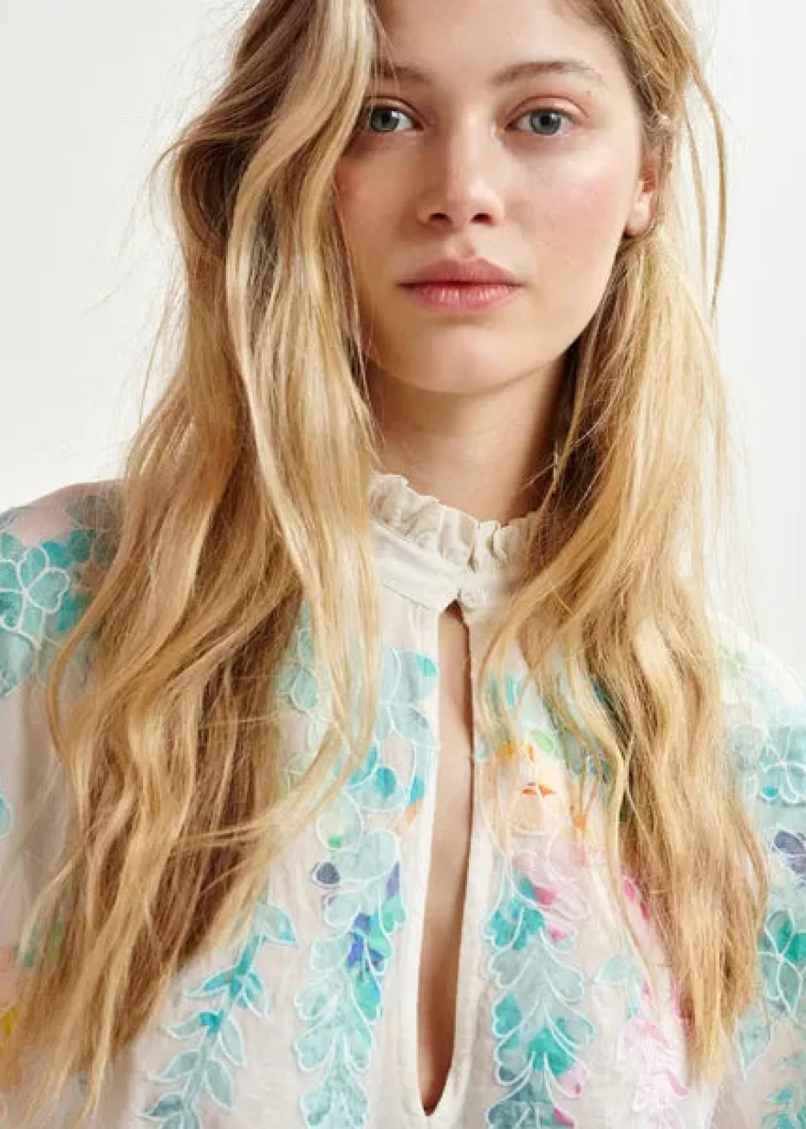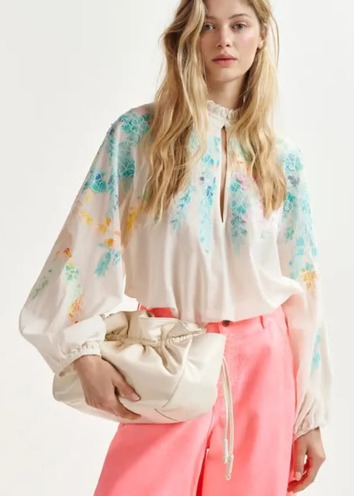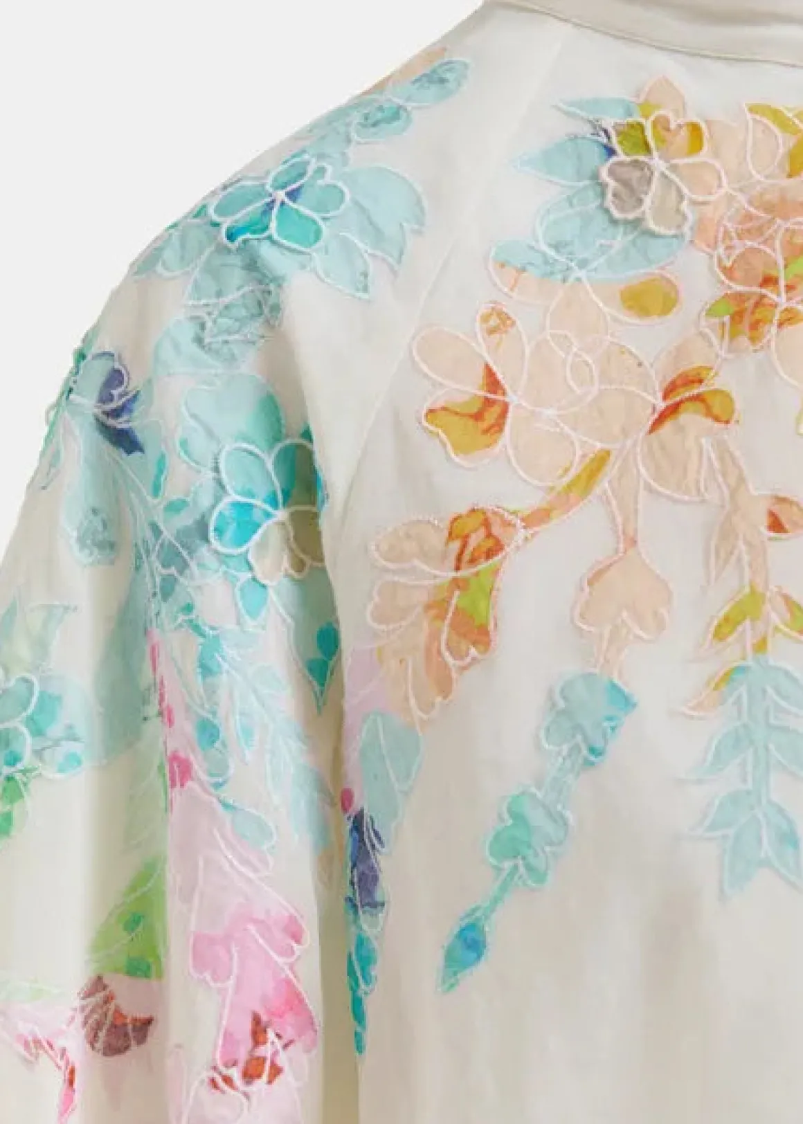 Crafted from crisp cotton-poplin, this top is made of 100% cotton and boasts vibrant, multicolored floral embroidery throughout. The voluminous balloon sleeves gather neatly at the elasticated cuffs, while the refined mandarin collar is accented by a subtle ruffle trim for added charm.