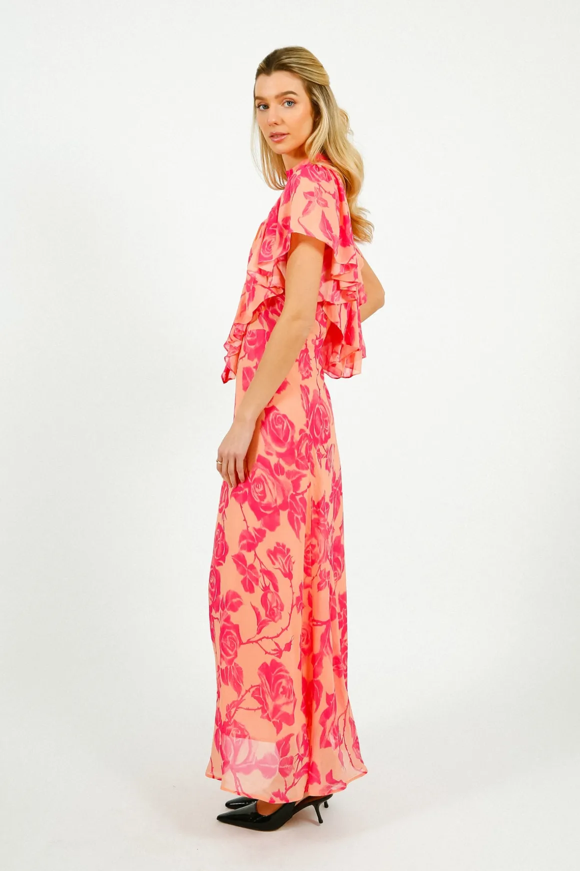 This midi dress showcases a relaxed fit with a flared silhouette that exudes effortless elegance. It boasts a high neck collar and V-shaped cut seams at the front and back, adorned with ruffle detailing. The asymmetrical design adds a modern edge, while the hidden zip fastening and partially lined construction ensure comfort. Make a stylish statement for any occasion with this stunning floral-print dress.