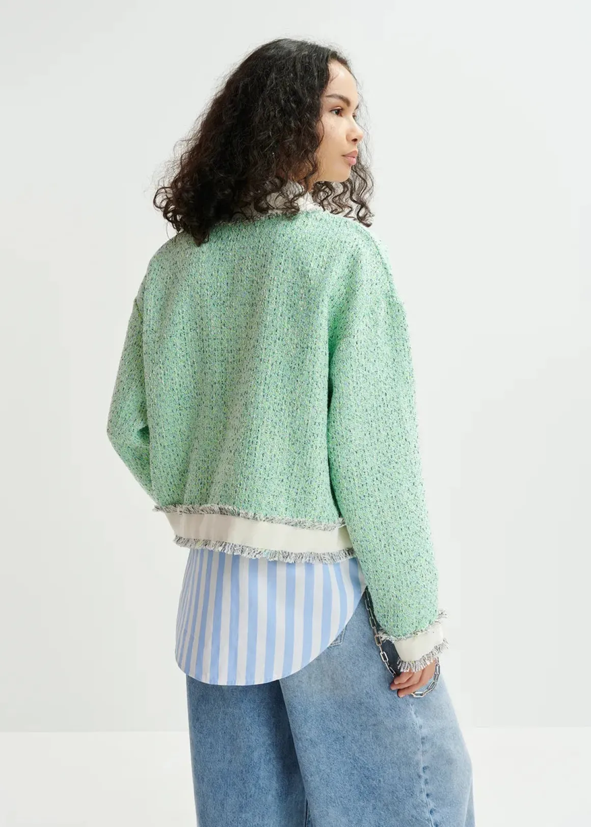 This cropped cardigan features a textured, tweed-inspired finish for a comfortably oversized and boxy silhouette perfect for layering. Complete with patch pockets and elegant grosgrain ribbon details.