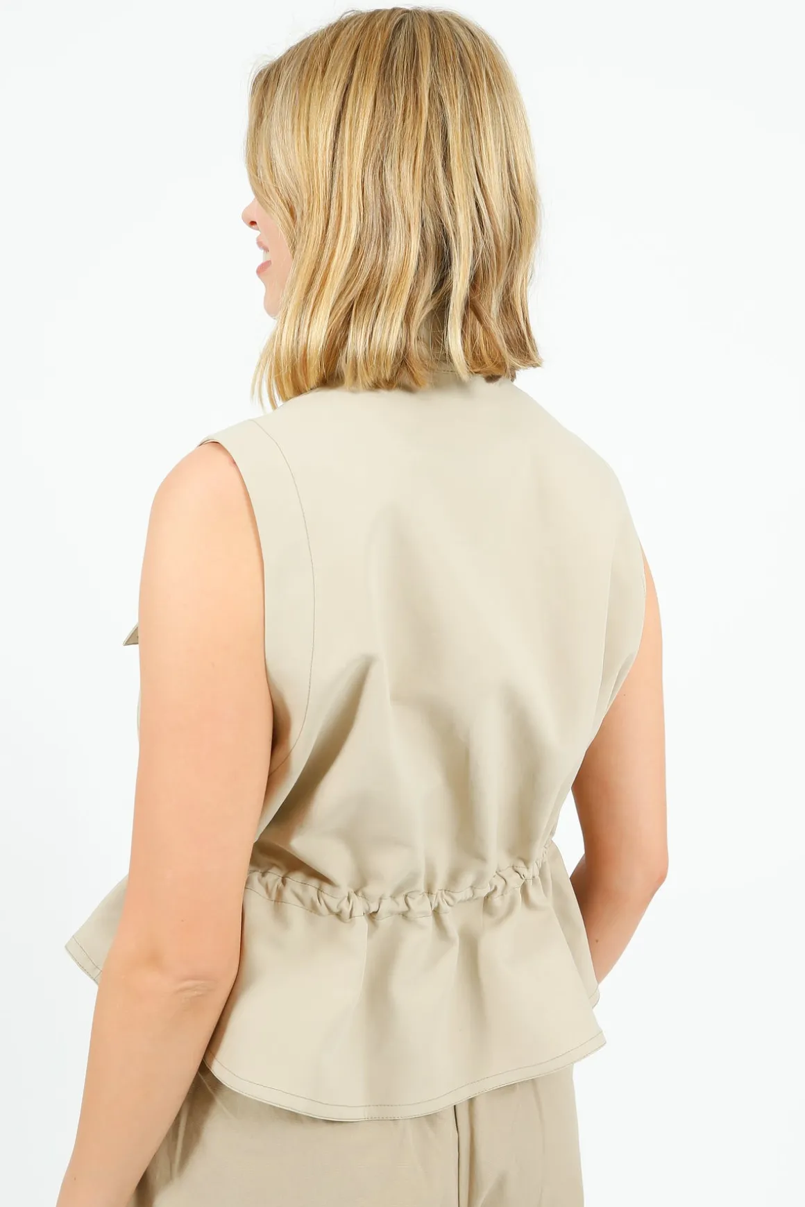 Cut from a natural cotton that’s soft and comfortable while retaining a strong structure, this beige utility vest jacket is a great layering piece all-year-round. This design features a high neckline, two front pockets and a unique double toggle detail at the waist which can be cinched for a more sculptural form, if desired. It fastens cleanly with a front popper fastening and falls to a cropped boxy fit.