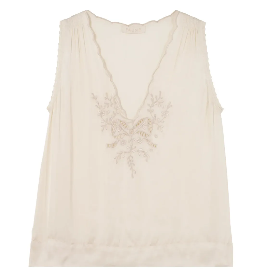 Experience the charm of a vintage flee market find with FAUNE’s Remi blouse in Oyster. Made with our signature silky modal satin, this stunning piece includes a lace insert bow embroidery at the front, trimmed armholes, and a scalloped ‘V’ neckline. Finished with a delicate lace hem and double band, you’ll be head over-heels for Remi in no time!