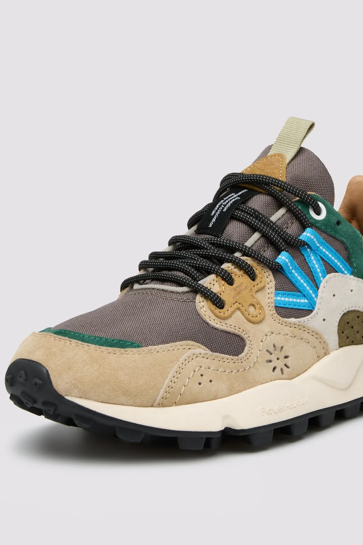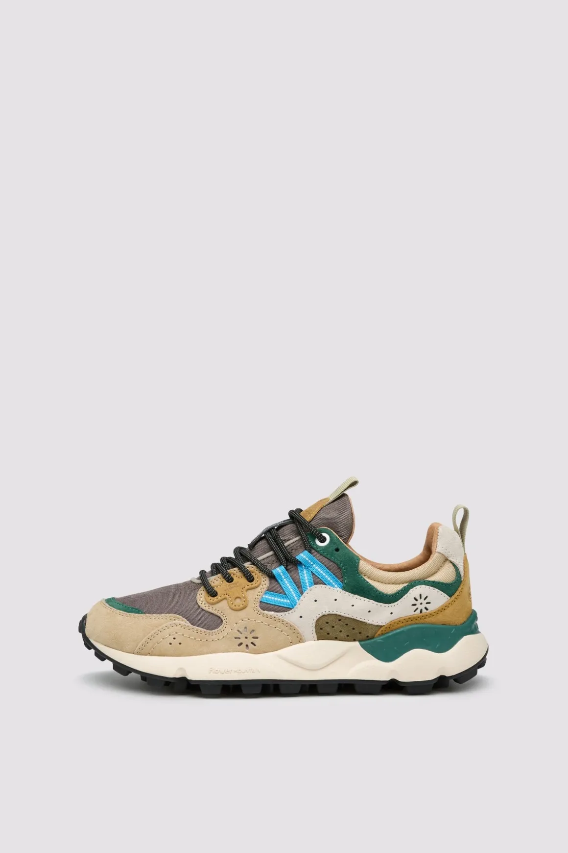 Sporty and outdoor inspired, the Yamano sneaker combine active details with a cool aesthetic: perfect for the city as well. The technical fabric upper features suede details with the distinctive overlapping construction, trekking laces and floral shaped eyelet. The sole is made of ultra-light rubber, with a coloured spoiler under the heel and toothed tread. The antibacterial natural cork insole protects the foot while ensuring all-day-long comfort.