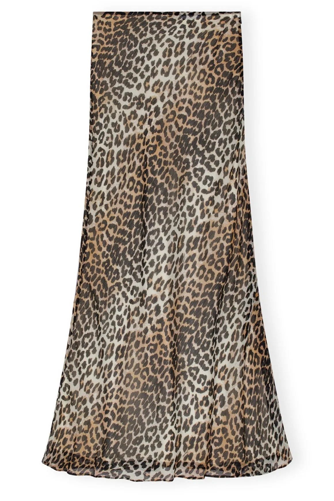 The GANNI F9306 Printed Chiffon Maxi Skirt in Almond Milk showcases a striking leopard print and a comfortable elasticated waistband.