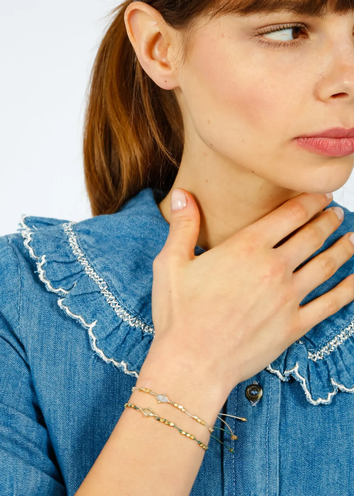 The Gigi wraps in Green features a beautiful Peridot with gold beads. It Fastens using a knot pull-through, making it suitable for most wrists.