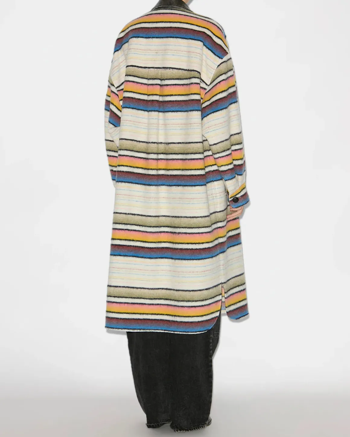 Elevate your outerwear collection with the IM Djila Coat in Multi. This coat features a luxurious wool blend with a striking striped design, accented by a leather collar and buttoned front. With long sleeves, patch pockets, and a relaxed fit, this coat offers both style and functionality. Perfect for any occasion, it’s a must-have for the fashion-forward individual.