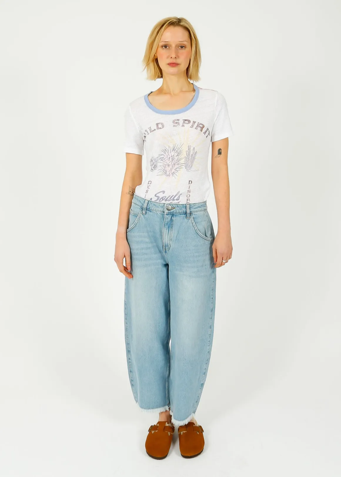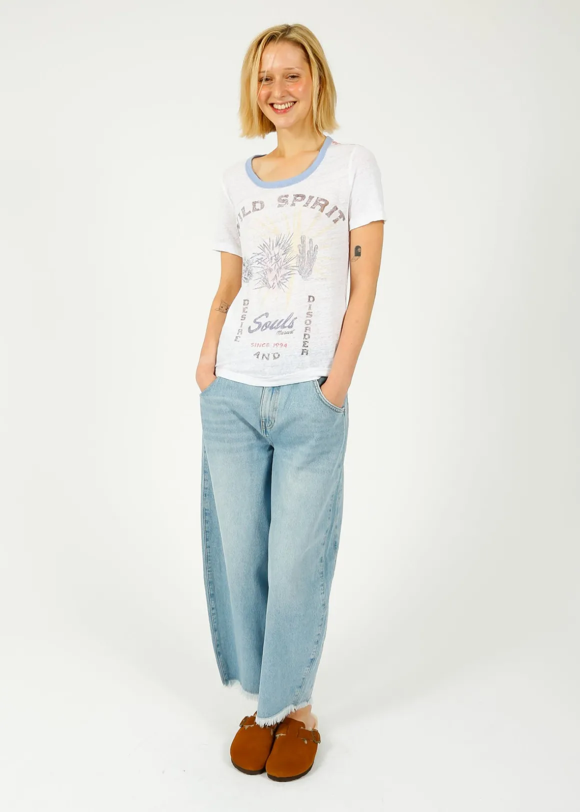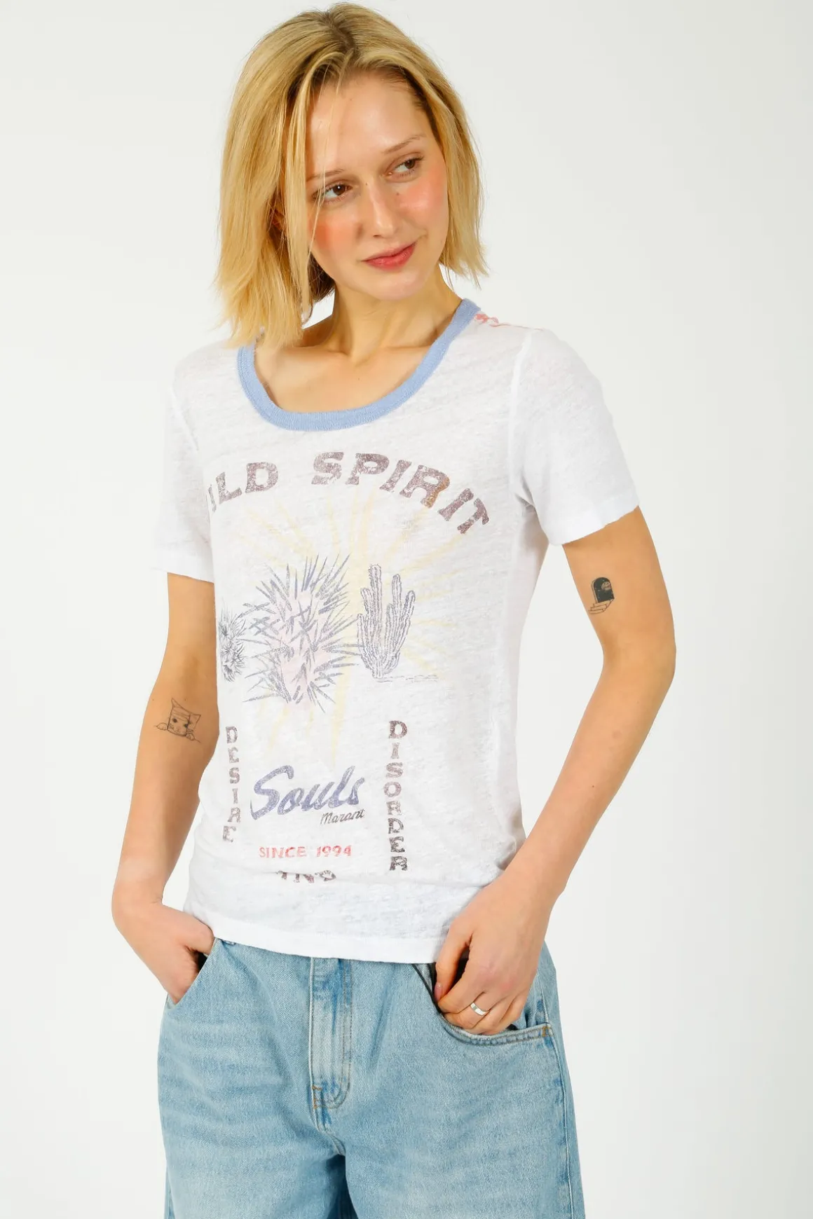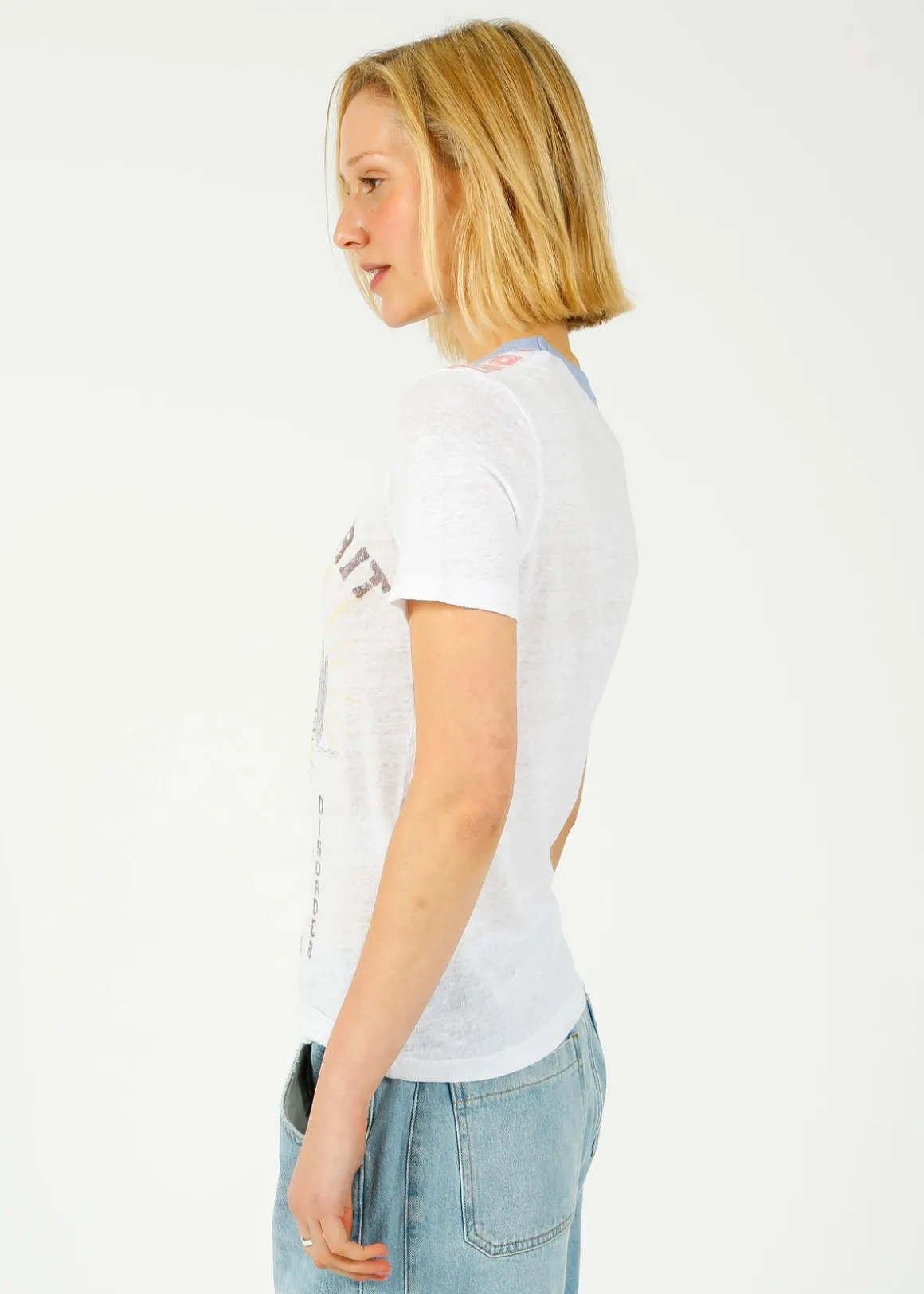 Experience elevated style with the IM Kiliann Tee in White, Blue. Made of 100% linen, this graphic tee boasts a U-neckline and short sleeves for a free-spirited, bohemian vibe. With its effortless comfort and chic design, this tee is a must-have for your wardrobe.