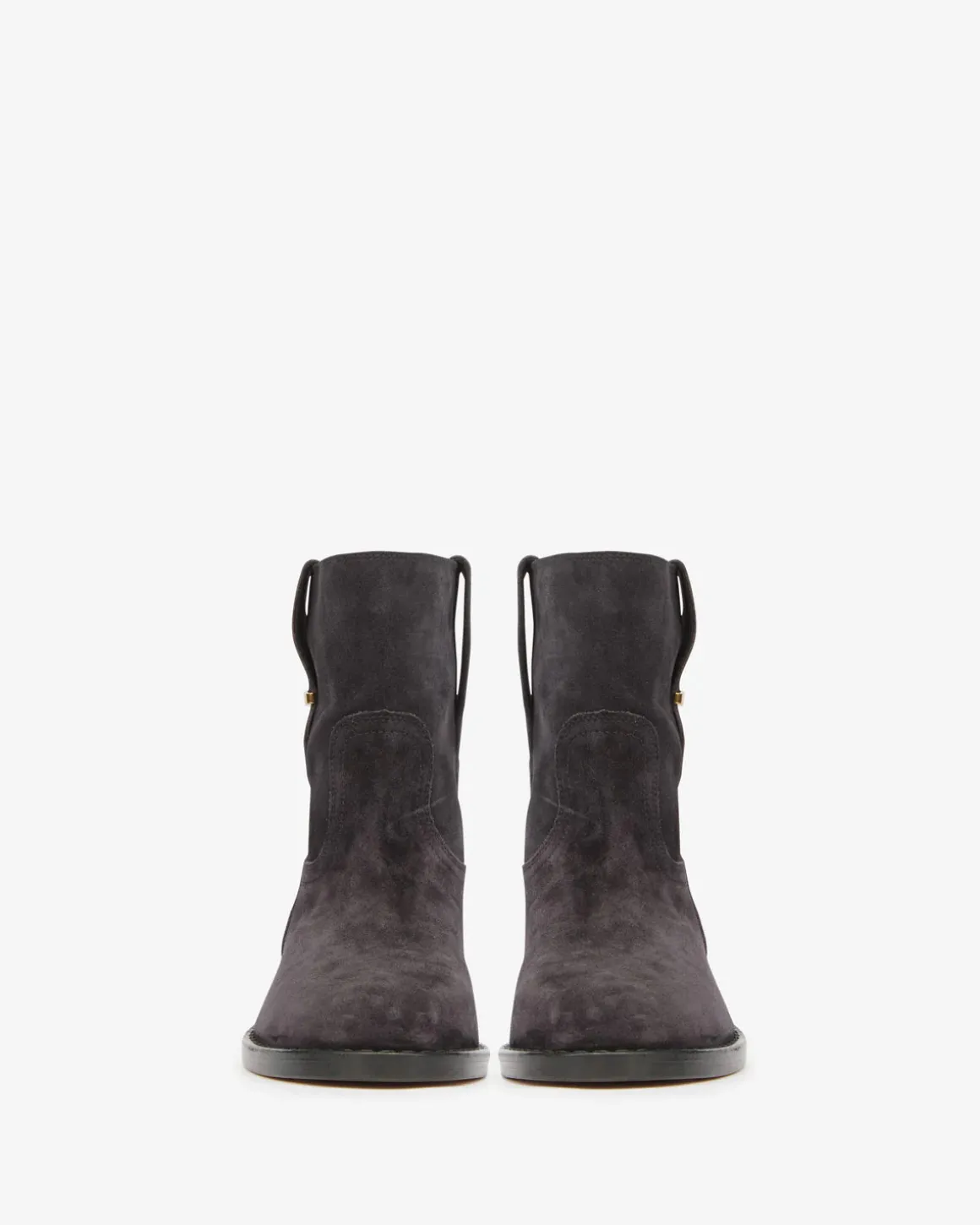 Elevate your style with the IM Lylie Boot in Faded Black. Crafted from 100% suede calfskin leather, these boots feature round toes, a gold-finish metal plate with an “Isabel Marant” engraving, and laminated leather heels. The soft leather insoles, outsoles, and lining provide ultimate comfort and luxury. Elevate your wardrobe with these stylish boots.