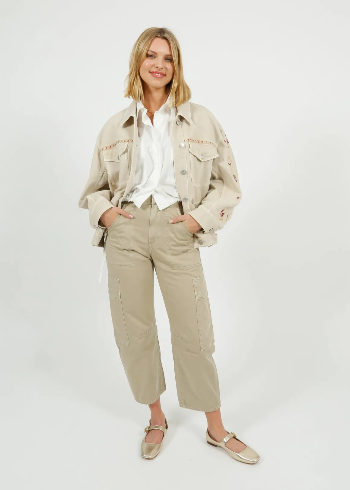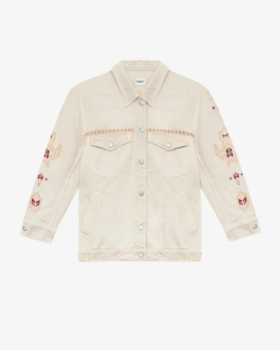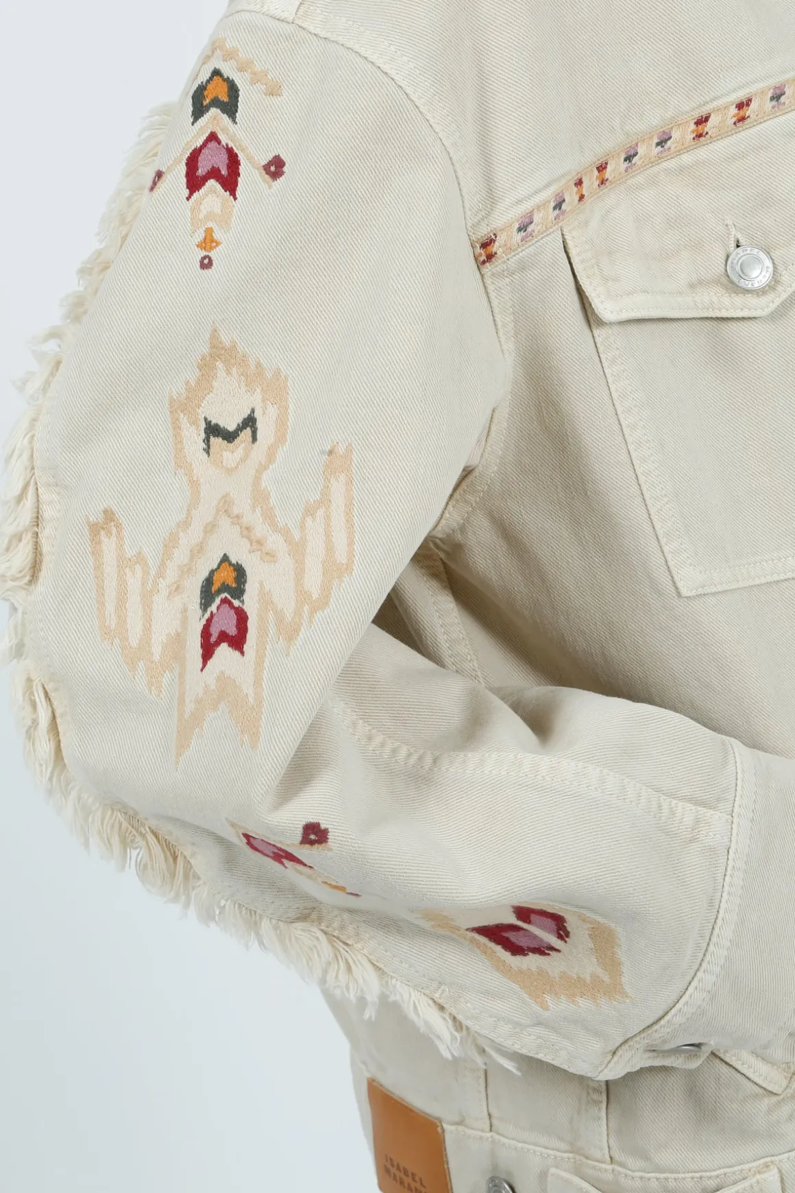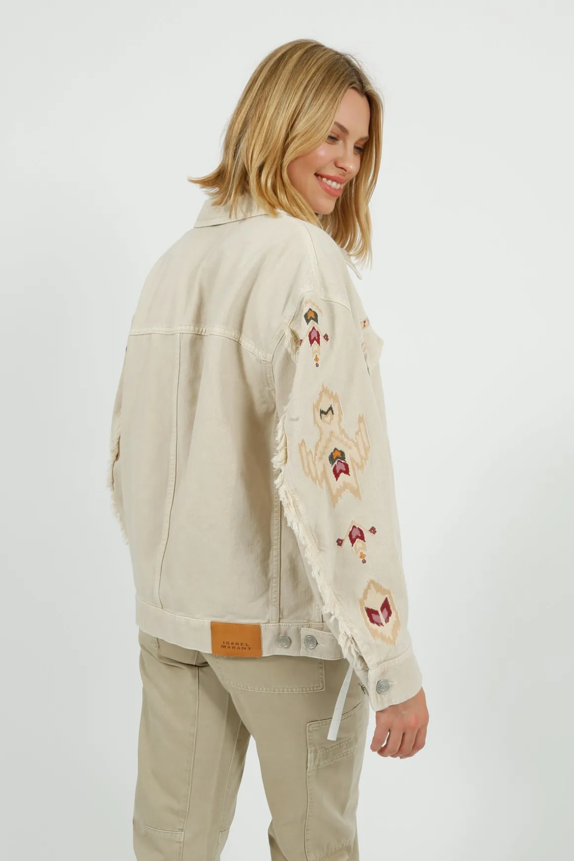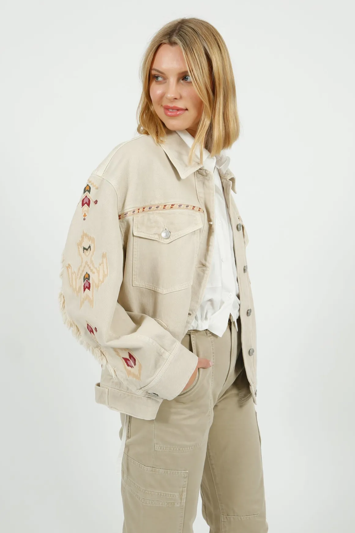 Elevate your style with the IM Manona Jacket in Ecru. Made from 80% cotton and 20% hemp, this jacket features long sleeves with fringes and straight buttoned cuffs for a unique touch. The buttoned front and patch pockets with flaps add functionality, while the embroidered graphic design and leather label add a chic touch. With a relaxed fit and waistband with buttoned tabs, this jacket is perfect for any occasion.