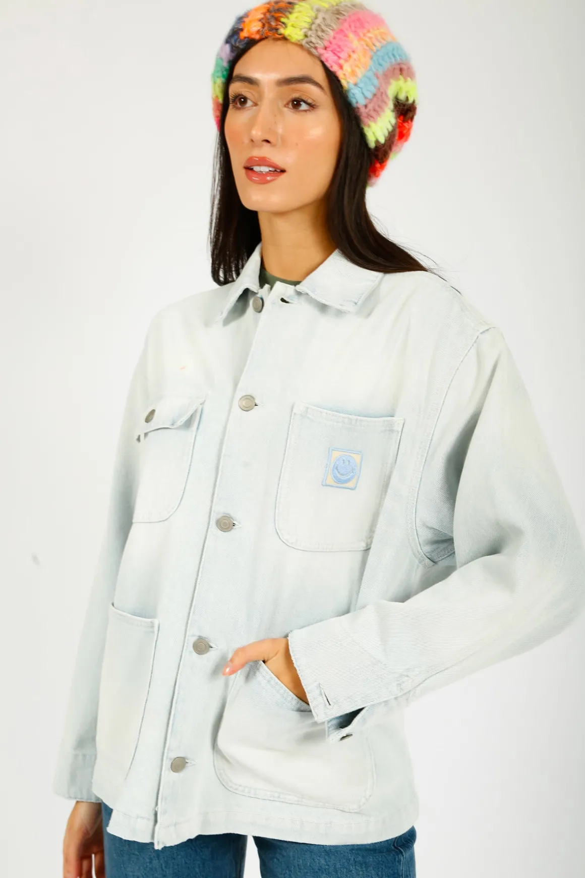 Upgrade your wardrobe with this 100% cotton light blue denim jacket, designed in a timeless chore jacket style. Featuring a classic collar, long sleeves, and four practical pockets, it seamlessly combines functionality with effortless style. Perfect for layering, this versatile piece adds a touch of casual sophistication to any outfit, making it a must-have staple for every season.