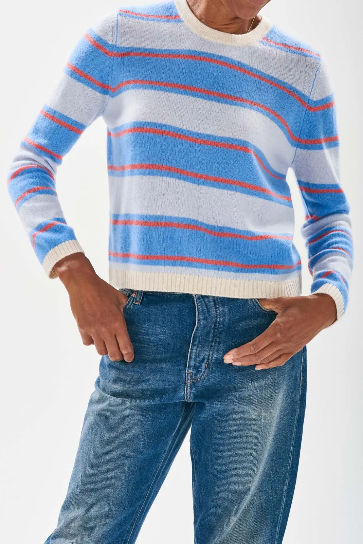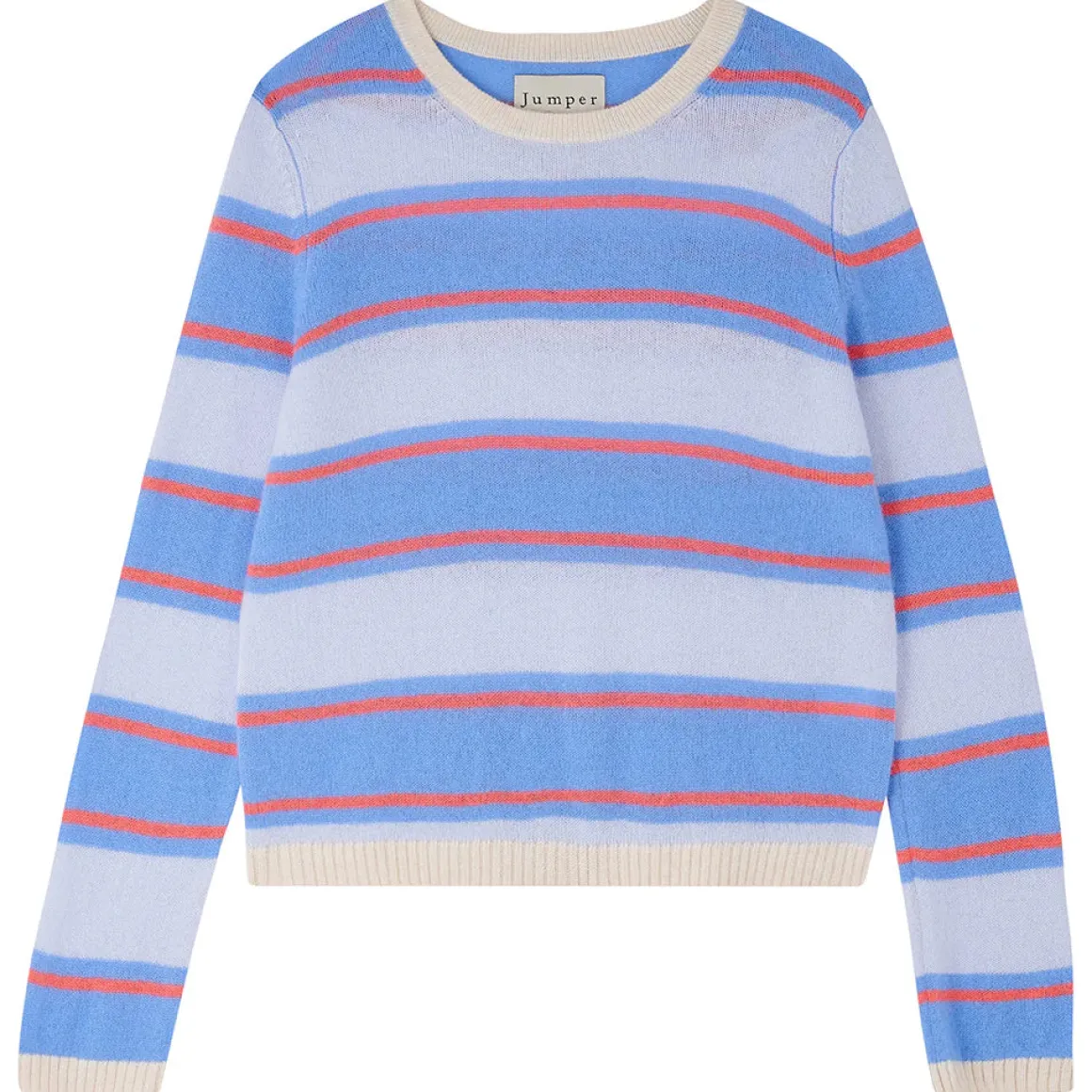 Experience luxurious comfort with our Jumper 1234 cashmere jumper in pale blue and sky stripes. The crew neck design features oatmeal ribs and a narrow mandarin stripe for a stylish touch. Made with lightweight cashmere, this jumper will keep you warm and fashionable all day long.