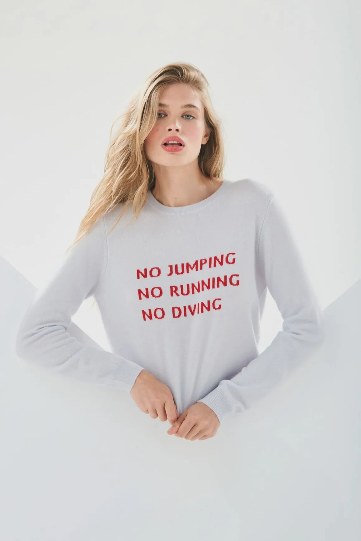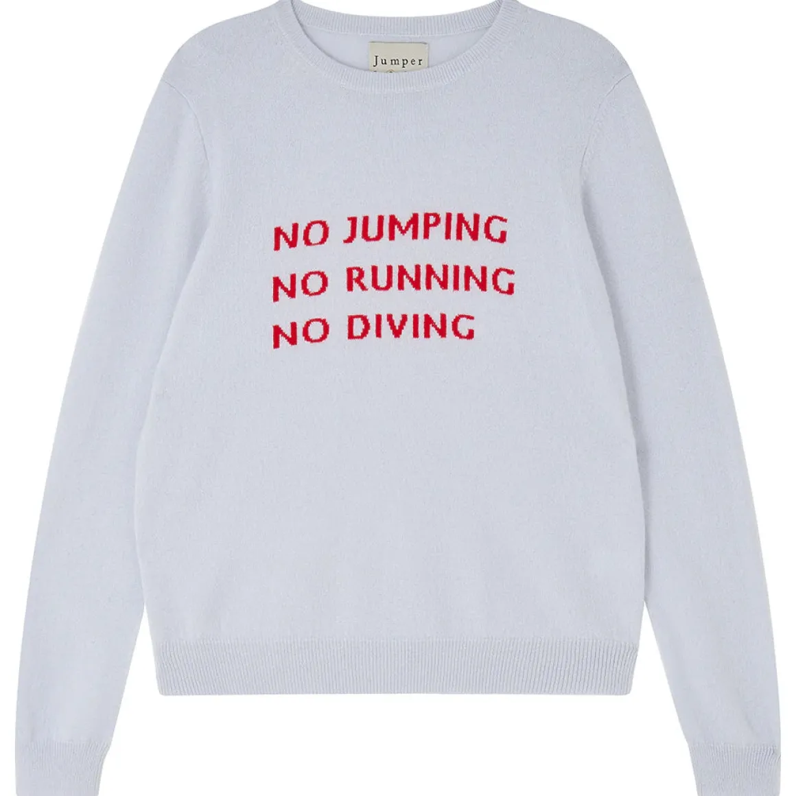 Indulge in the ultimate luxury with the JU Don’t Do It in Skygrey, Rose. Experience the softness of pure cashmere in this pale grey crew neck jumper featuring a bold red ‘no jumping, no running, no diving’ intarsia design.