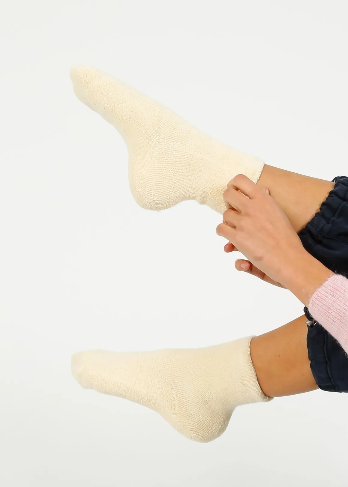 Experience the comfort of walking on clouds with LBS Cloud Socks in Ecru! These unbelievably cozy and stylish socks are made from a special fluffy, terry cotton blend that is both breathable and one-of-a-kind. The exterior is soft and fluffy, while the interior is smooth and airy. Perfectly pair them with your go-to clogs or slides for added cushion and style all year round.