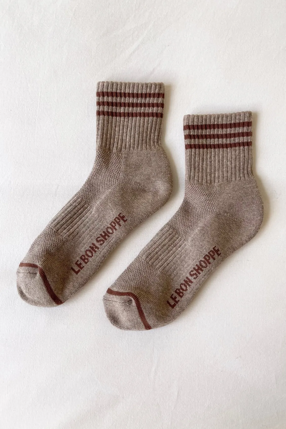 The “Girlfriend Socks” are a cool version of LBS’s classic “Boyfriend Socks”. These socks have a triple contrast stripe at the opening and are shorter in length than the classic crew sock. They are a universally flattering and quintessential sock, especially for petite ladies.