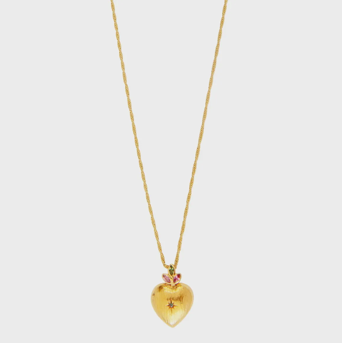 Golden Heart necklace composed of a magnificent heart-shaped medallion in gold-plated brass, 18 carats and three semi-precious tourmaline stones.