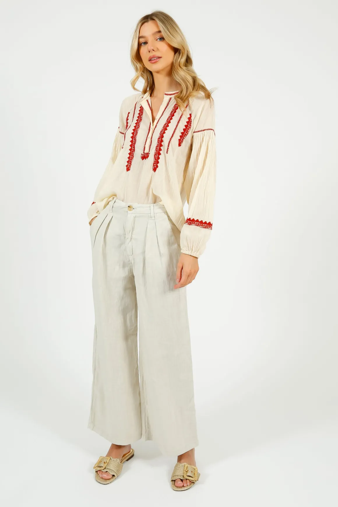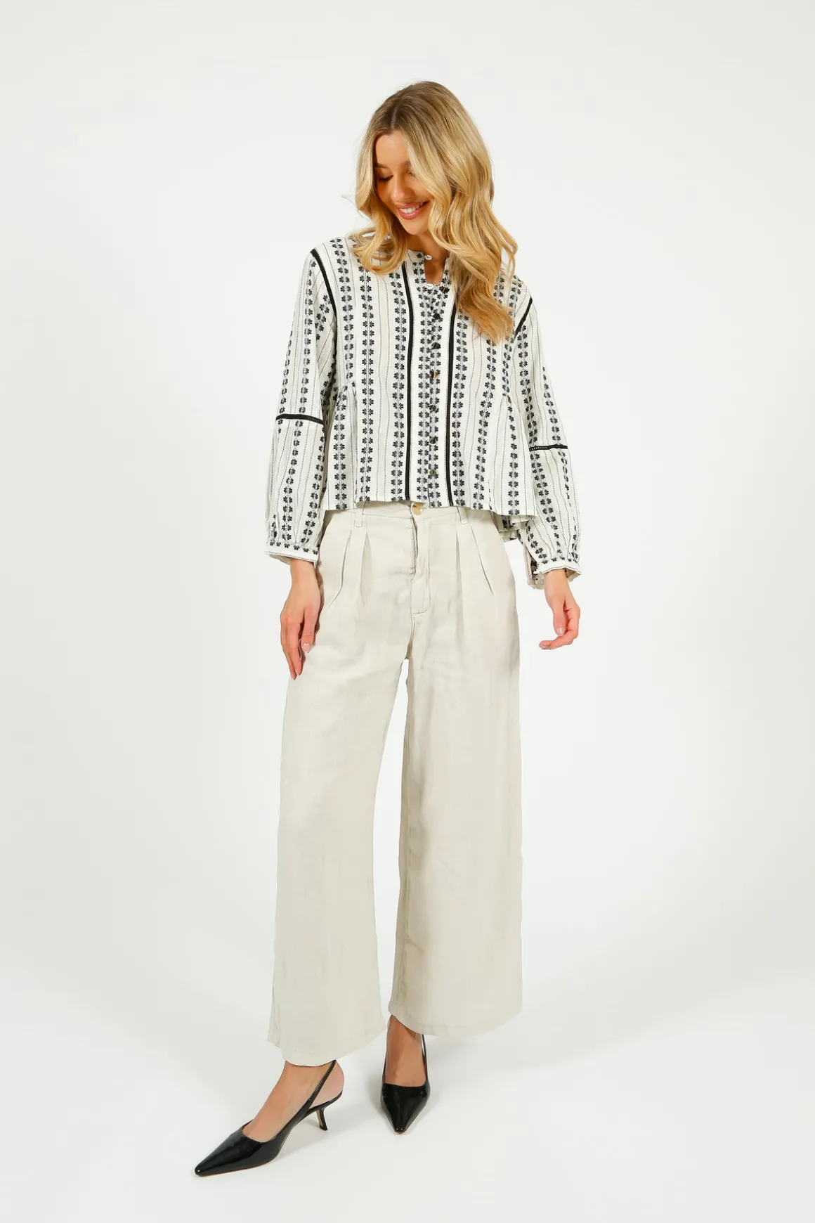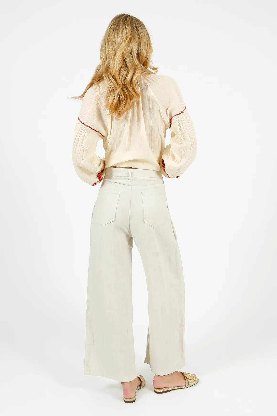 Elevate your wardrobe with the MAISON H Marisa Linen Pant in Off White. Expertly crafted in Spain with high quality linen, this button and zip pant is a must-have for any season. Mix and match with different pieces to create versatile and stylish looks. Available now for a limited time only!