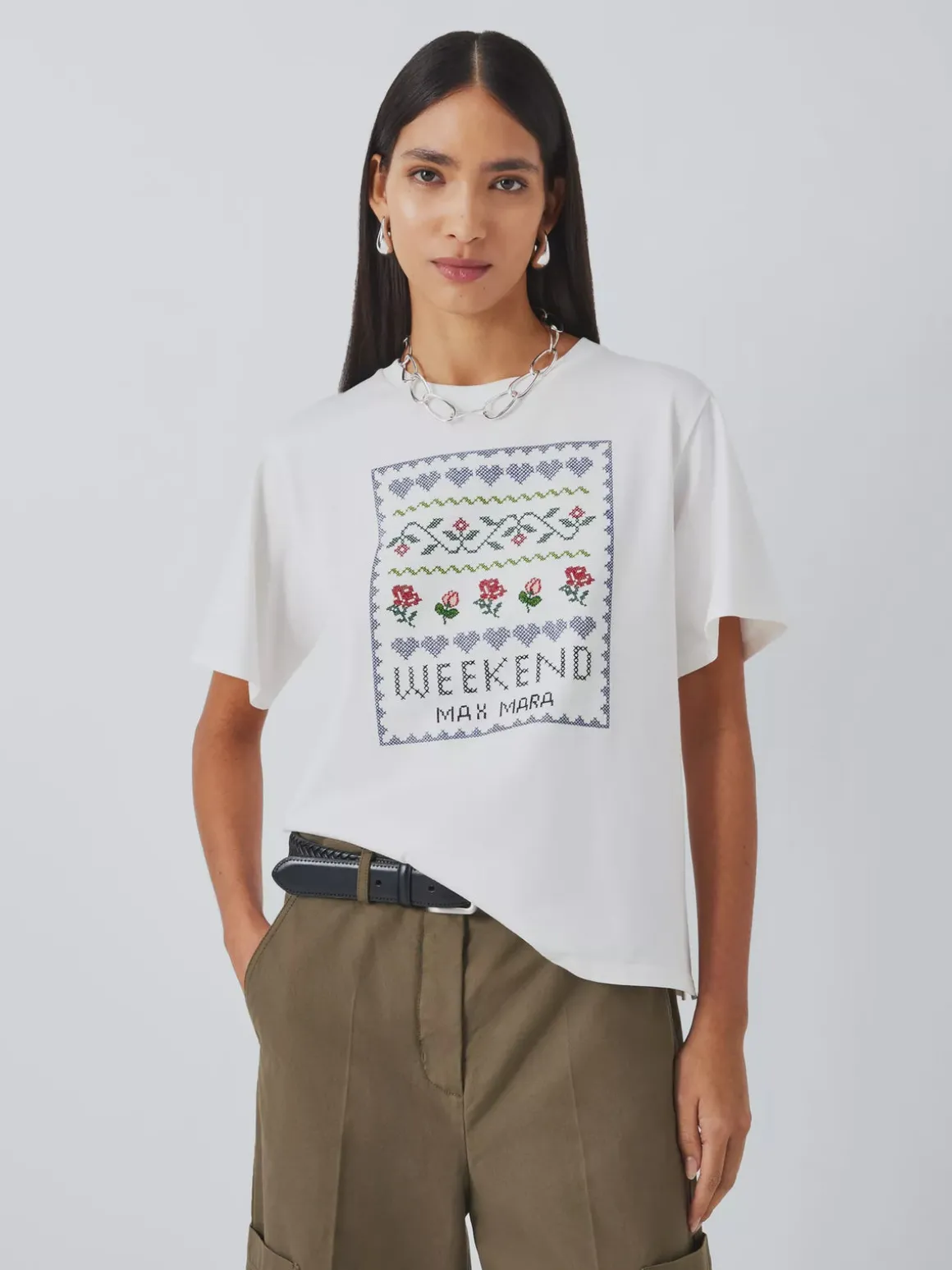 This cotton t-shirt from Weekend MaxMara features a cross-stitch floral graphic, which is the foundation for all your looks.