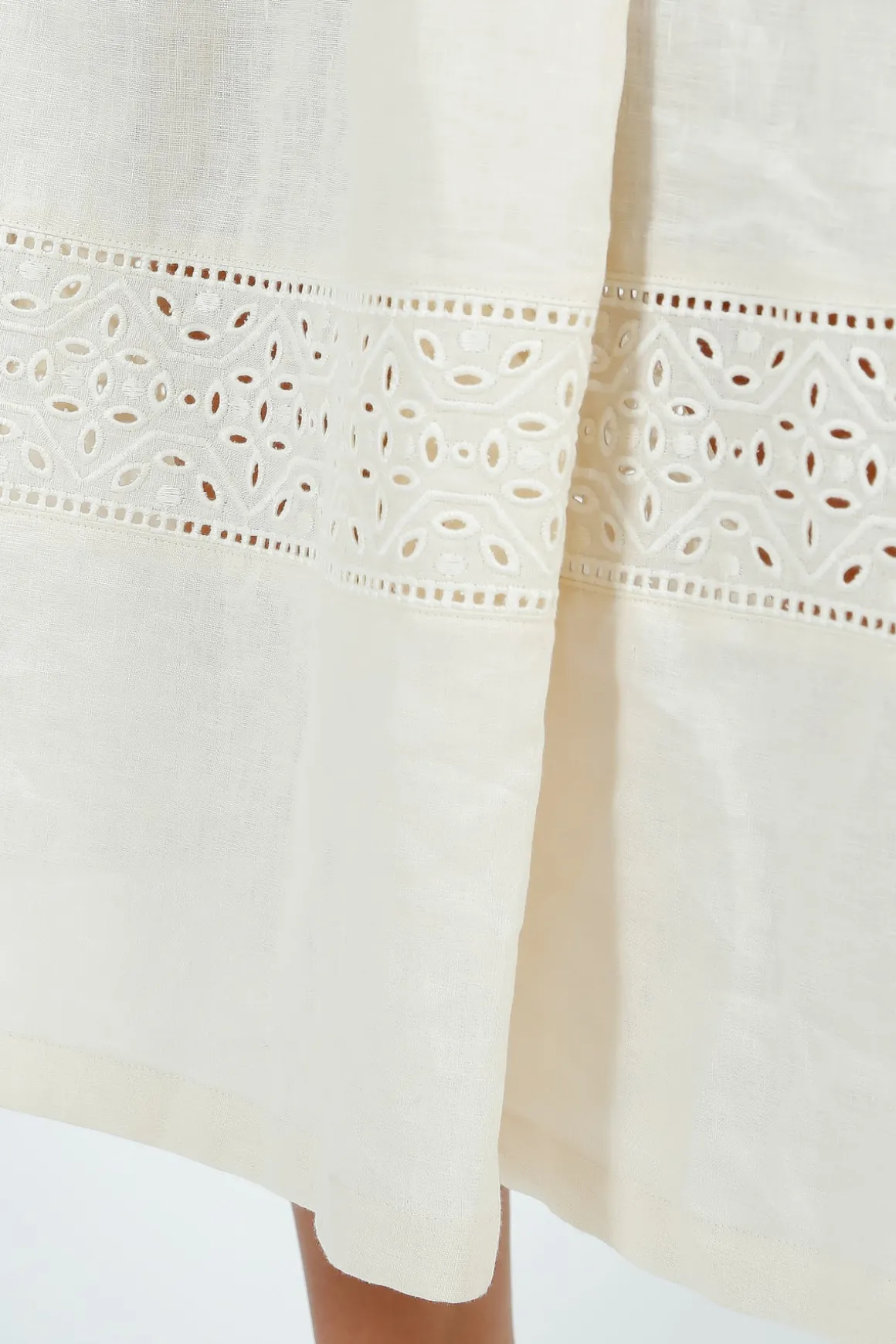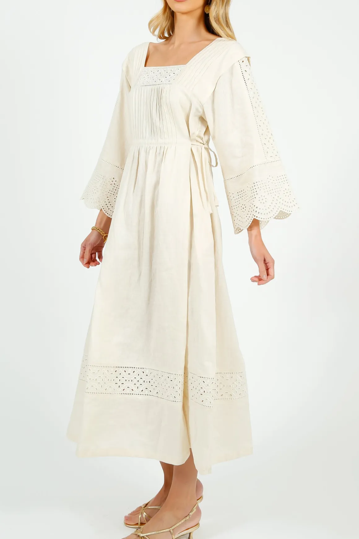 Long, loose dress made of pure linen canvas, with a square neckline, three-quarter length kimono sleeves with scalloped cuff and a full skirt with side inset pockets. Unlined style, embellished with inlaid pintucks on the shoulders, eyelet embroidery trim details and an adjustable drawstring at the waist with side tassels.