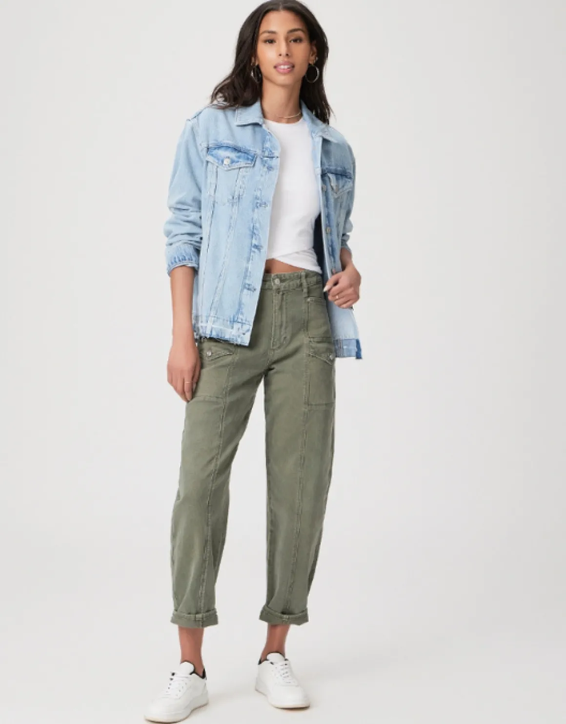 The Paige Alexis are a feminine take on classic cargo trousers. A barrel leg sihouette with a high waist; the Alexis is effortlessly chic and crafted from super soft denim in Vintage Ivy Green. They have the perfect amount of stretch for the most comfortable fit.