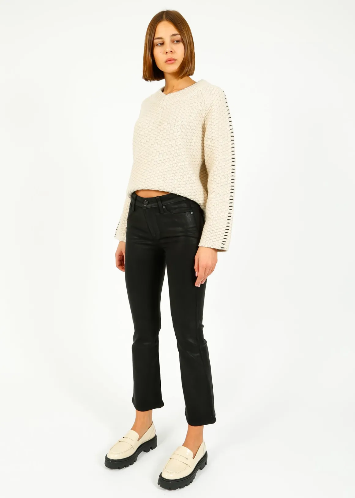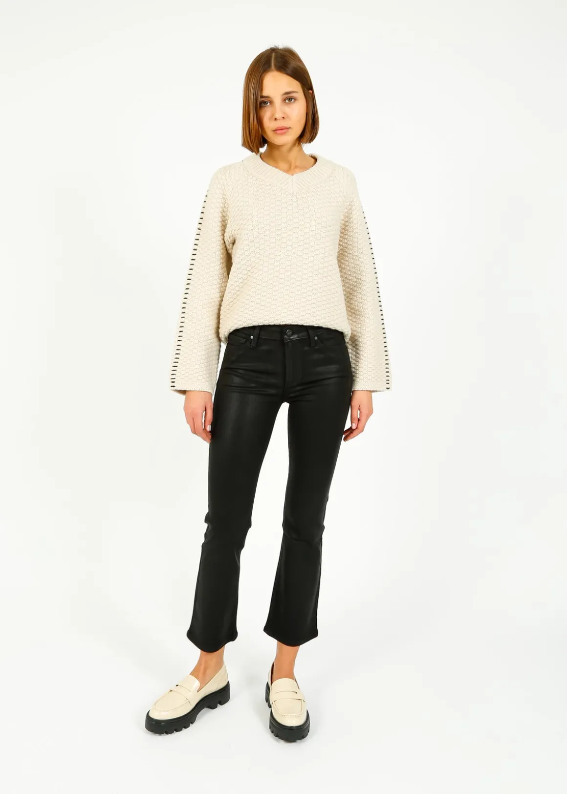 Transform your look with PAIGE Claudine in Black Fog Luxe Coating. The black coated finish adds an edgy touch, while the classic five pockets provide practicality. Designed with a flared silhouette, this pair is perfect for dressing up or down. Upgrade your wardrobe with this must-have piece!