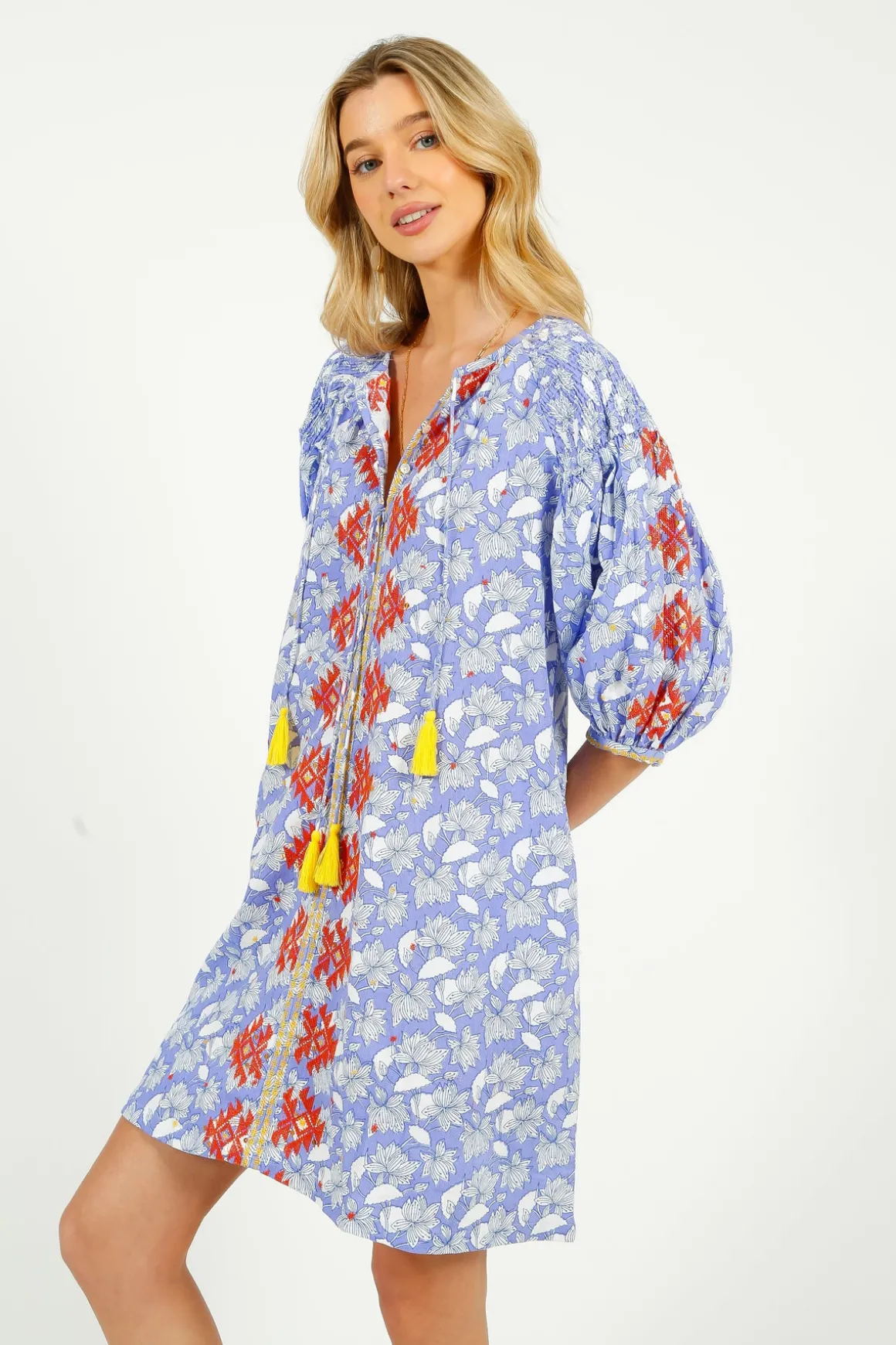 Elevate your style with the PDS 328 Lila Print Dress! Made from 100% cotton for ultimate comfort, this dress features a 3/4 length v-neck and front button closure. The vibrant orange aztec embroidery and stunning lilac floral print add a pop of color and personality to any outfit. Stand out from the crowd and feel confident in this bold and beautiful dress!