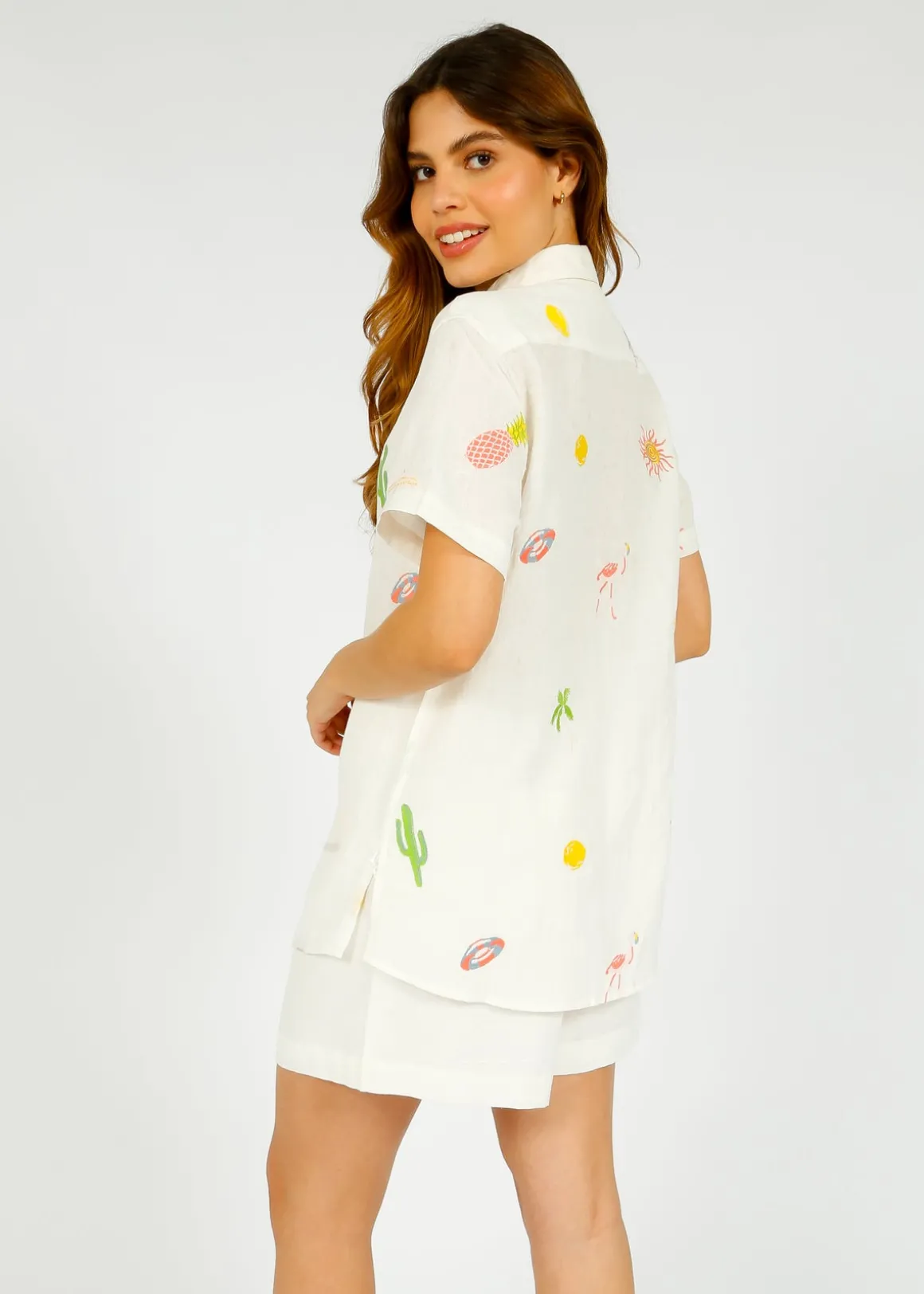 A fresh take on the classic linen shirt, this short-sleeved style is crafted from a lightweight cotton-linen blend, making it an effortless warm-weather staple. Cool Palm Springs-inspired embroidery adds a playful yet refined touch. Wear it tucked into the Poppy shorts for a day of sightseeing, or leave it open over a bikini with linen trousers for effortless beachside style.