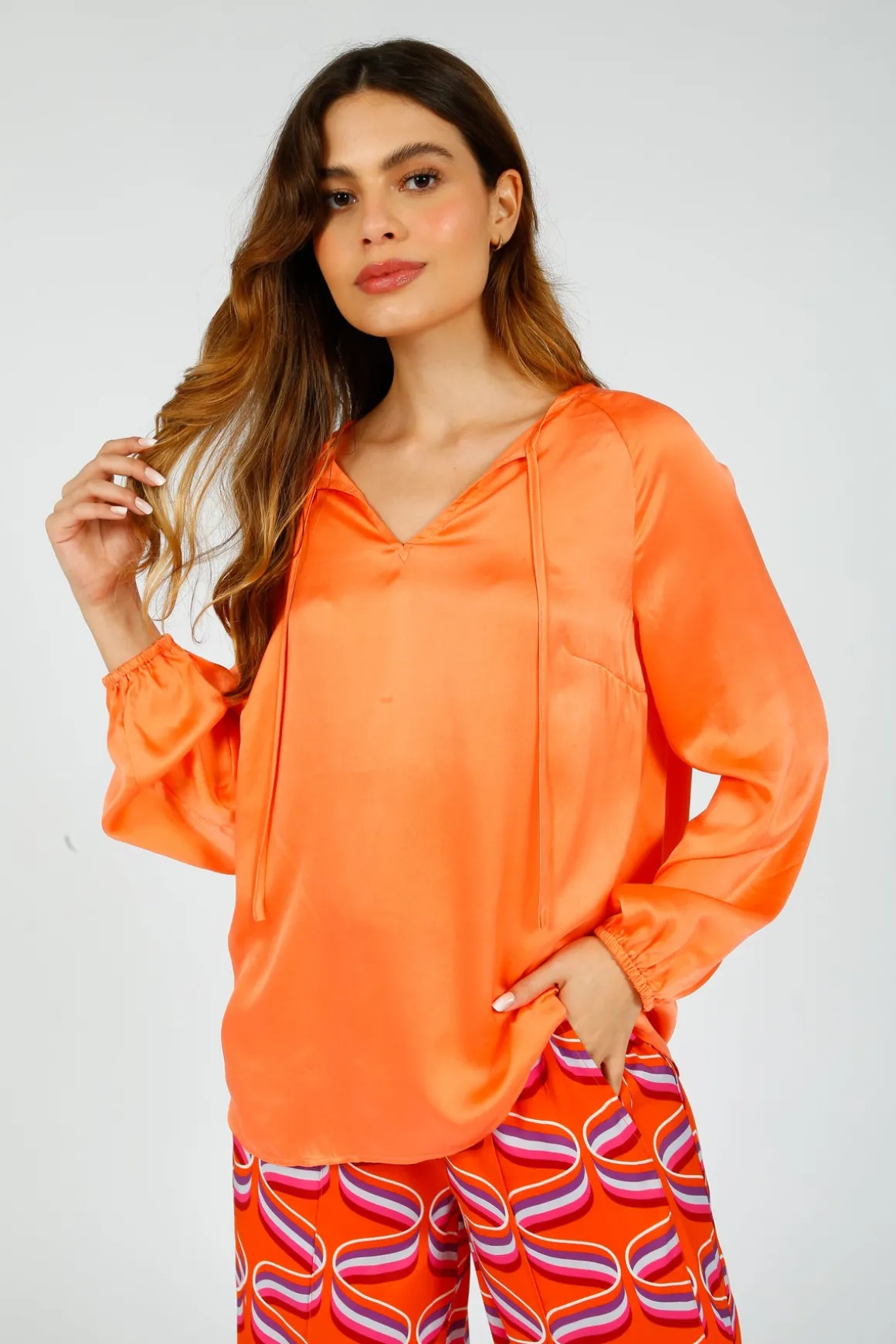 Crafted from sumptuous silk in a vibrant salmon hue, this effortlessly elegant top is designed with a classic raglan sleeve for a fluid, relaxed fit. The billowy silhouette is finished with long, loose sleeves and elasticated cuffs for ease and comfort, while delicate ties at the V-neckline allow for versatile styling—worn open or fastened for a softer, rounded look. Style it with tailored white linen trousers and heels for a polished finish, or pair it with jeans and trainers for an elevated yet effortless everyday look.