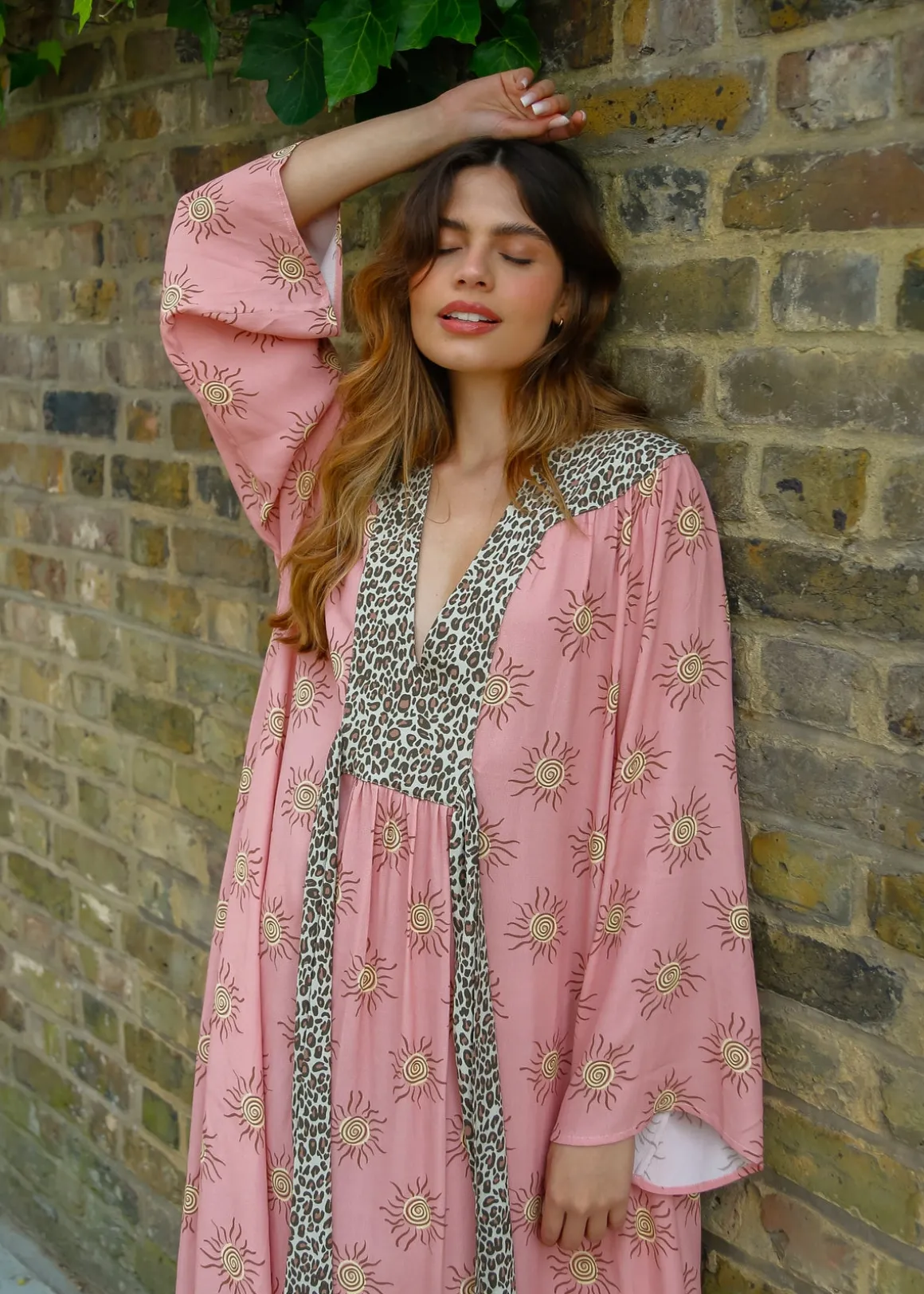 Experience a bold ’70s vibe with this statement maxi dress that beautifully combines vibrant stripes and leopard print. Made with luxurious silky viscose, it boasts a flattering V-neck, graceful flared sleeves, and a self-tie waist that flatters all body types. From elegant events to relaxed beach outings, this standout piece is sure to make a statement and capture attention.