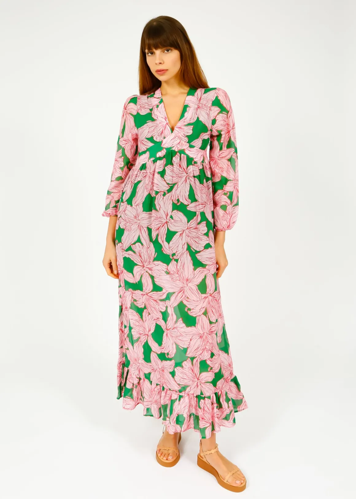 Indulge in a touch of elegance with our PPL Daisy Dress in Lily 01 Pink and Green. Made from a luxurious blend of 70% cotton and 30% silk, this maxi dress features a V-neckline and adorable puff sleeves. The tiered hem and zip fastening add a modern touch, while the stunning pink and green floral print adds a touch of whimsy. Perfect for any occasion, this dress is sure to make you feel confident and beautiful.
