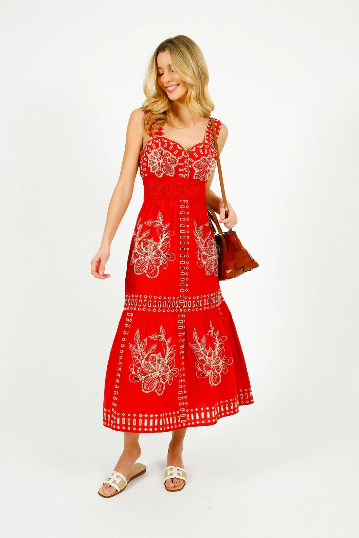 Transform your wardrobe with the RAILS Fawn Dress in Terracotta! This dress boasts an exquisite embroidered design and a flattering shirred waist that effortlessly combines style and comfort. The thick straps provide support and the tiered A-line skirt adds a playful touch, all crafted from soft and breathable terracotta cotton poplin.