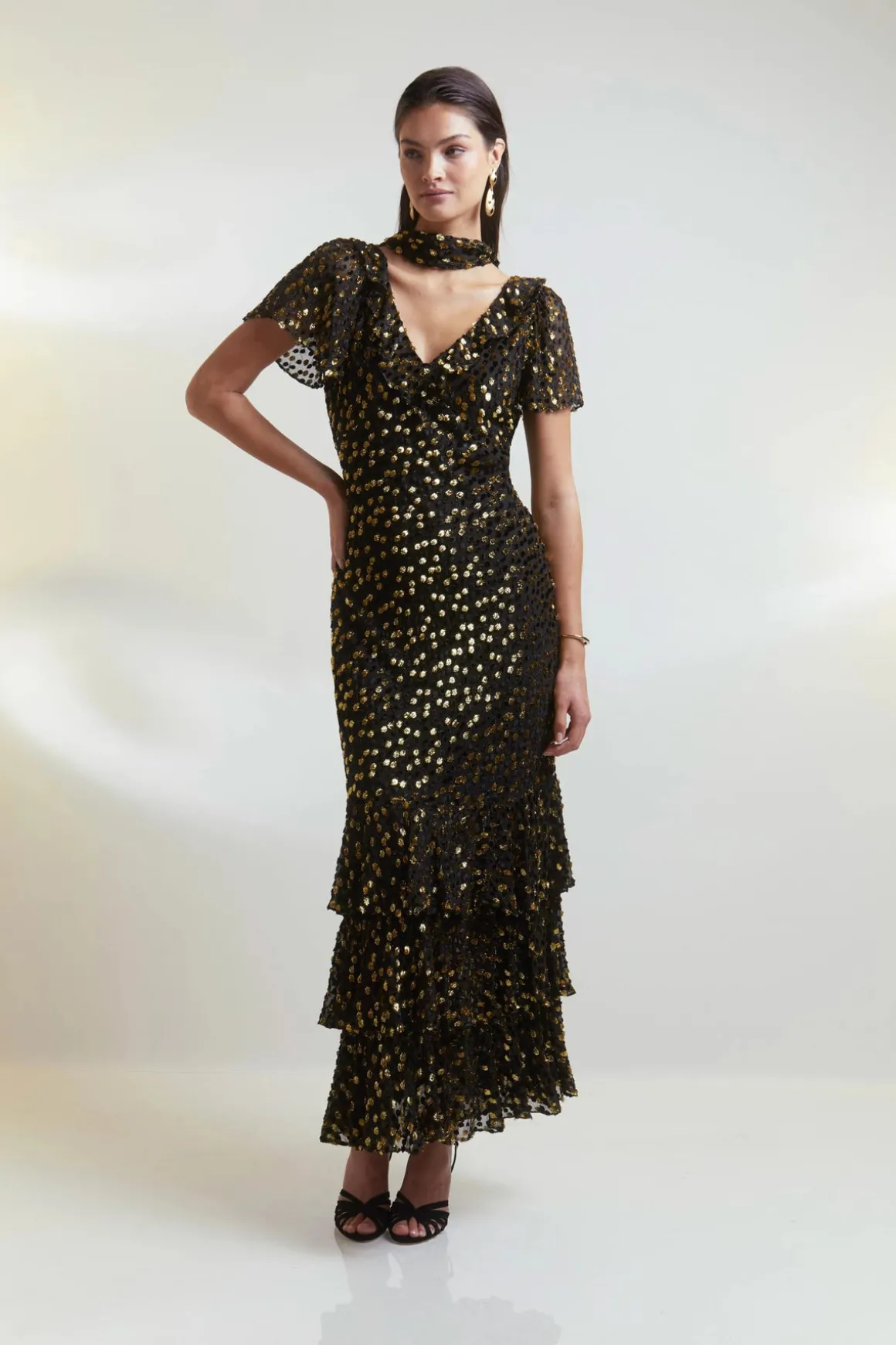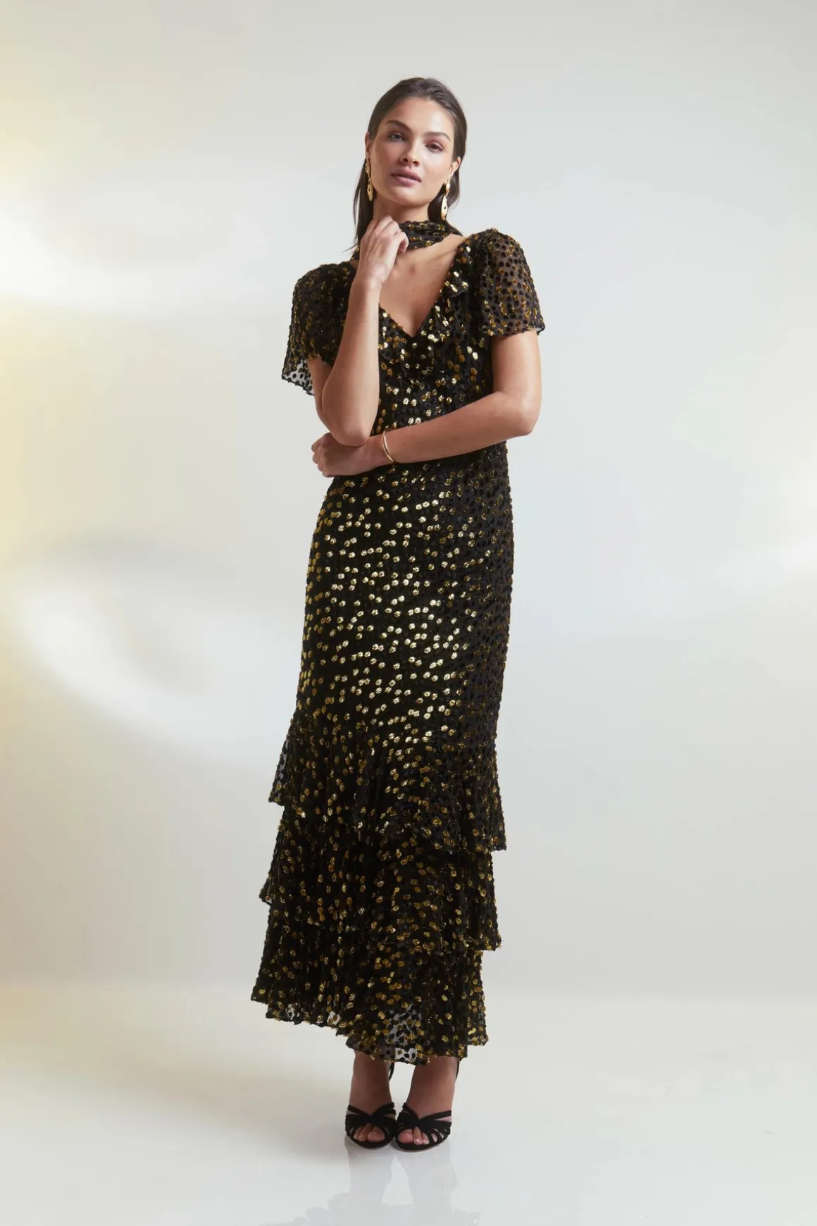 Dazzle in the RIXO Amelle Dress, made with a stunning blend of polyamide, viscose, and metallic fibers. Its V-neckline and ruffle details add elegance, while the tiered maxi skirt and concealed zip fastening make it perfect for events. Feel confident and stylish in this must-have dress!