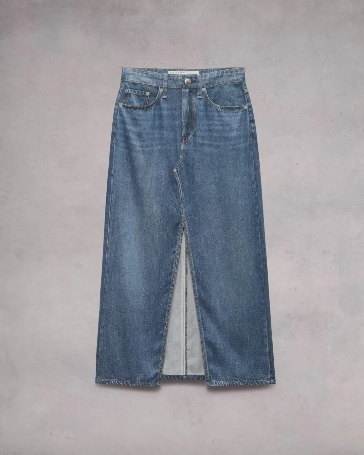 The Clara. Your favorite pair of jeans updated as a midi skirt. Crafted in Miramar, a super-soft cotton terry that looks like denim, feels nothing like it. In Cameron, a medium indigo blue with printed rivets and seams, and real belt loops.