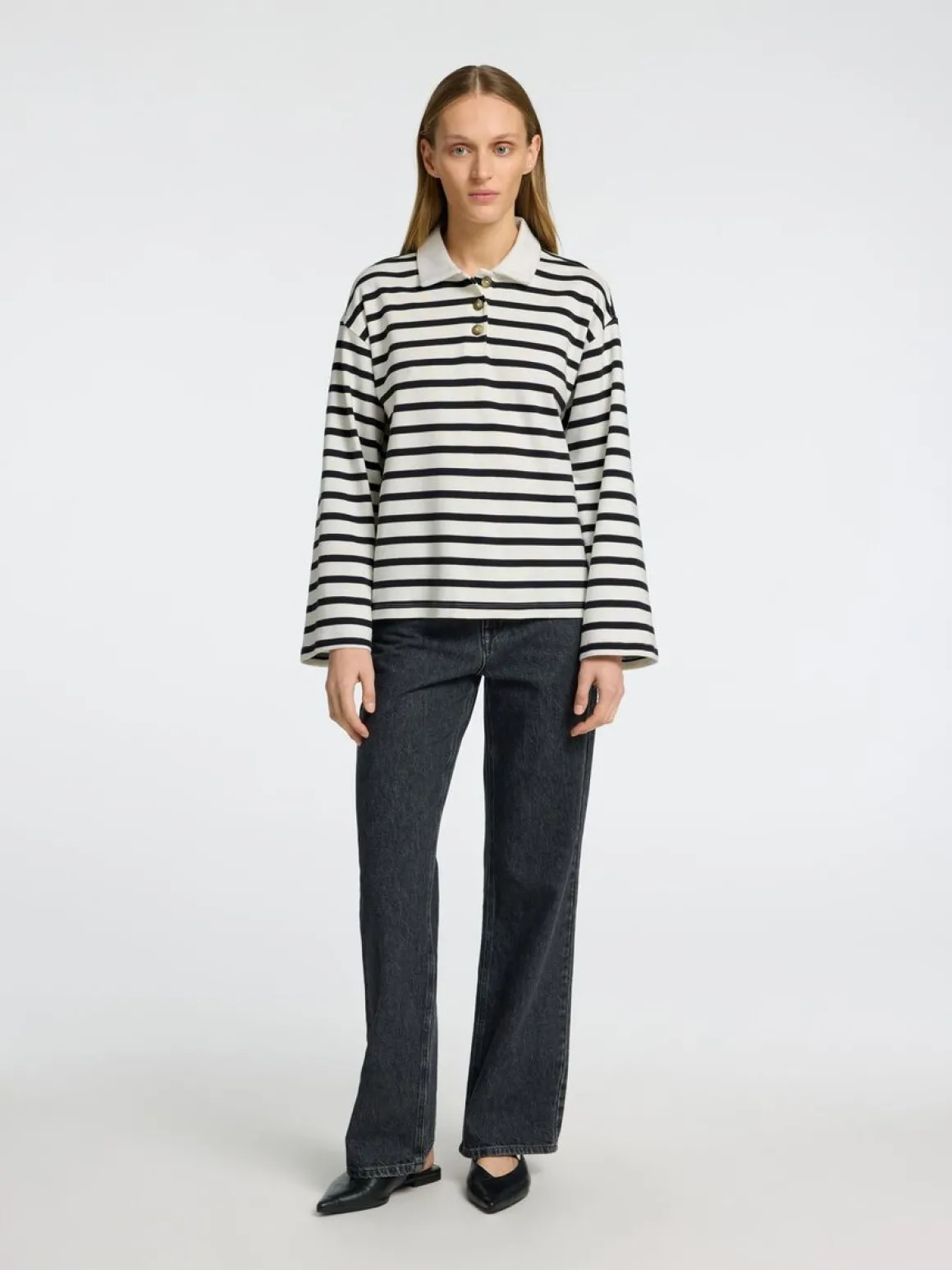 - Polo collar – Quarter-button placket – Dropped shoulders – Long sleeves – Boxy fit